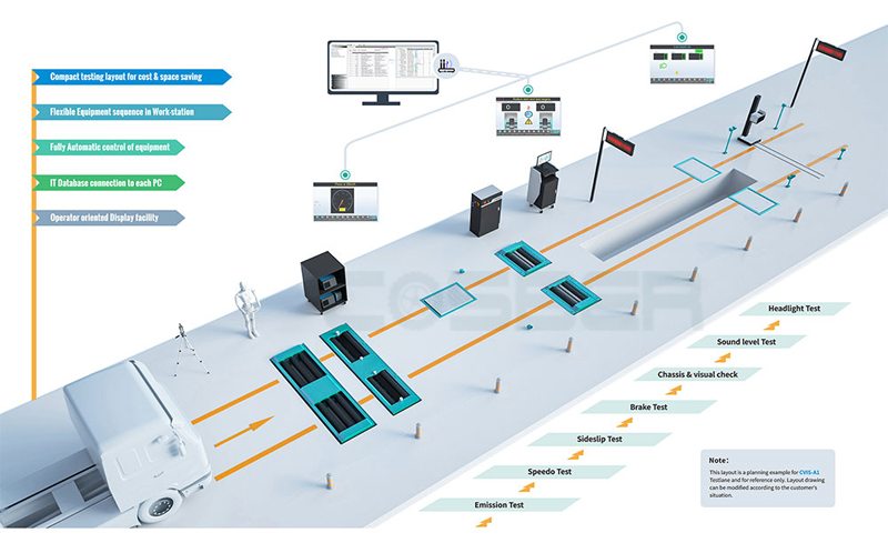 Komunikasi digital antara komputer dan peralatan yang saling terhubung memastikan keakuratan data inspeksi. Sistem ini dapat dioperasikan di bawah Vehicle Safety Technical Test dan All-purpose Test. Berkat logika program tingkat lanjut dan integrasi teknologi TI, efisiensi pengujian dapat ditingkatkan secara luar biasa dan pada saat yang sama pemantauan operasi inspeksi secara real-time dapat diimplementasikan dengan sempurna.
